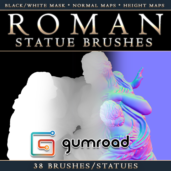 These are very high resolution renders from public domain 3D scan data of actual works of Roman and mythological art. In this pack, you'll get a black and white mask, height map, and normal map of many statues to use in your own textures, or as a supplement to my Roman Statue Textures tutorial lesson found here https://gumroad.com/l/kWrrB.